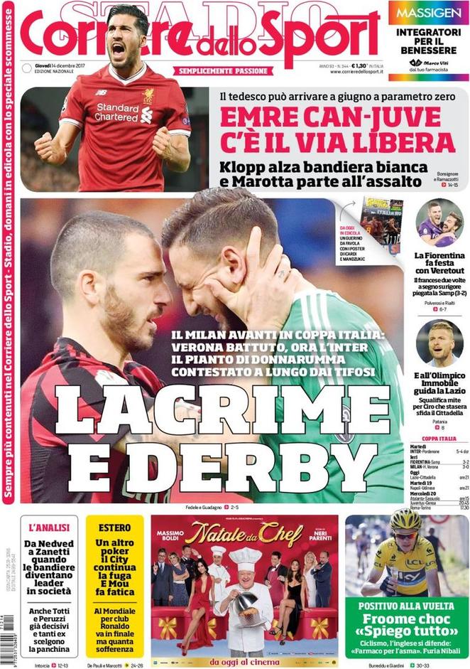 Il Corriere dello Sport apre titolando “Lacrime e Derby”: il chiaro riferimento è a Donnarumma e alla reazione del portiere rossonero alla dura contestazione che San Siro gli ha riservato. Emblematica la foto del n.1 stretto da Bonucci che cerca di rinfrancarlo. Ai quarti sarà derby contro l’Inter. Sul fronte mercato, “Emre Can-Juve, c’è il via libera: Klopp alza bandiera bianca, Marotta pronto all’assalto”.