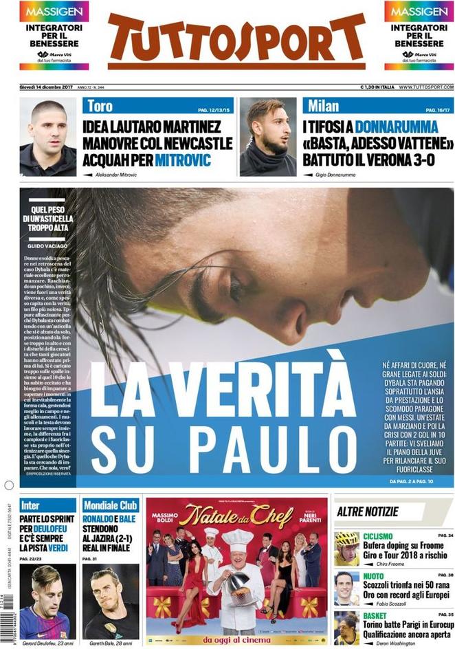 Tuttosport titola “La verità su Paulo”. Dietro al periodo buio del numero 10 bianconero, secondo il quotidiano torinese, non ci sarebbero questioni private né economiche, ma soltanto “un’ansia da prestazione” derivante dai paragoni spesi per lui durante l’estate, che hanno creato aspettative molto alte.