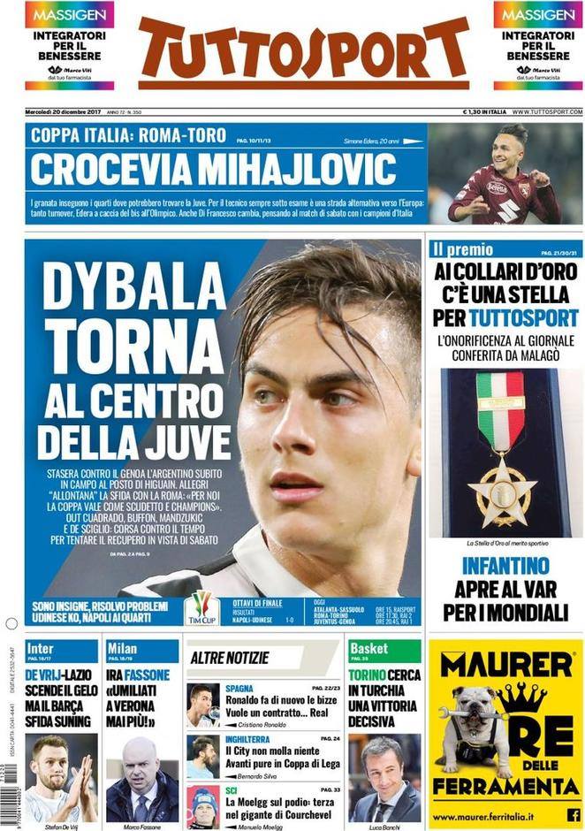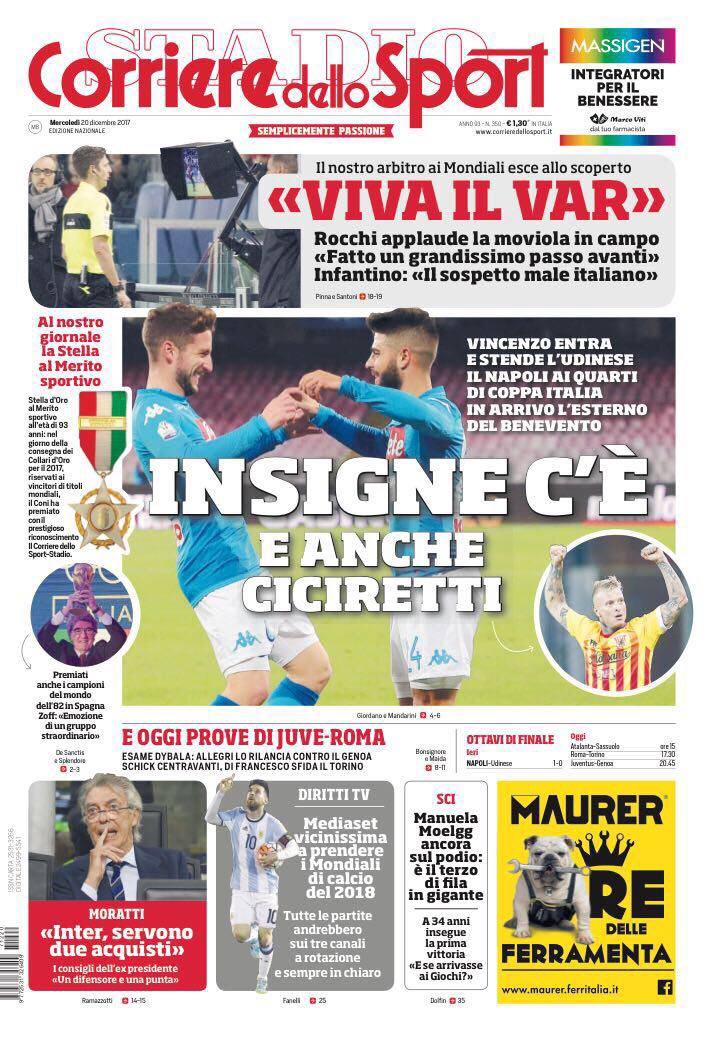 “Insigne c’è e anche Ciciretti”, così apre in prima pagina il Corriere dello Sport che torna sulla vittoria del Napoli sull’Udinese in Coppa Italia e sul mercato degli azzurri. In alto è “Viva il VAR”, mentre in taglio basso spazio alle altre sfide di Coppa e alle parole di Moratti. “Dybala torna al centro della Juve” questo invece il titolo sulla prima di Tuttosport che apre con i bianconeri, mentre in taglio alto si concentra sull’altra sfida di Coppa Italia tra Roma e Torino (“Crocevia Mihajlovic”). Di spalla la tecnologia con Infantino che apre al VAR per i Mondiali, mentre in basso spazio alle milanesi e al calcio estero. In basso occhio a De Vrij conteso tra Inter e Barcellona.