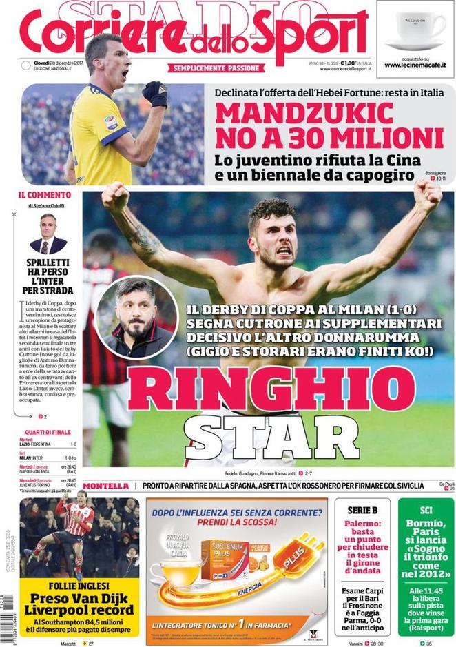 Il giorno dopo la sconfitta dell’Inter nel derby, Tuttosport e il Corriere dello Sport titolano all’unisono: viva Gattuso, crisi nerazzurra. Il quotidiano torinese grida “Ringhio Milan, urlo Cutrone”, in riferimento ovviamente al match winner dei quarti di finale di Coppa Italia. Il Corriere, invece, lo esalta addirittura a Star della stracittadina, vinta comunque ai supplementari grazie, più che al miracolo di Antonio Donnarumma, all’errore di Joao Mario sotto porta. Per Tuttosport, invece, è finalmente il momento di scrivere “Inter in crisi”, ancora riferendosi al match di San Siro, nel quale è maturato il terzo ko di fila per la squadra di Spalletti.