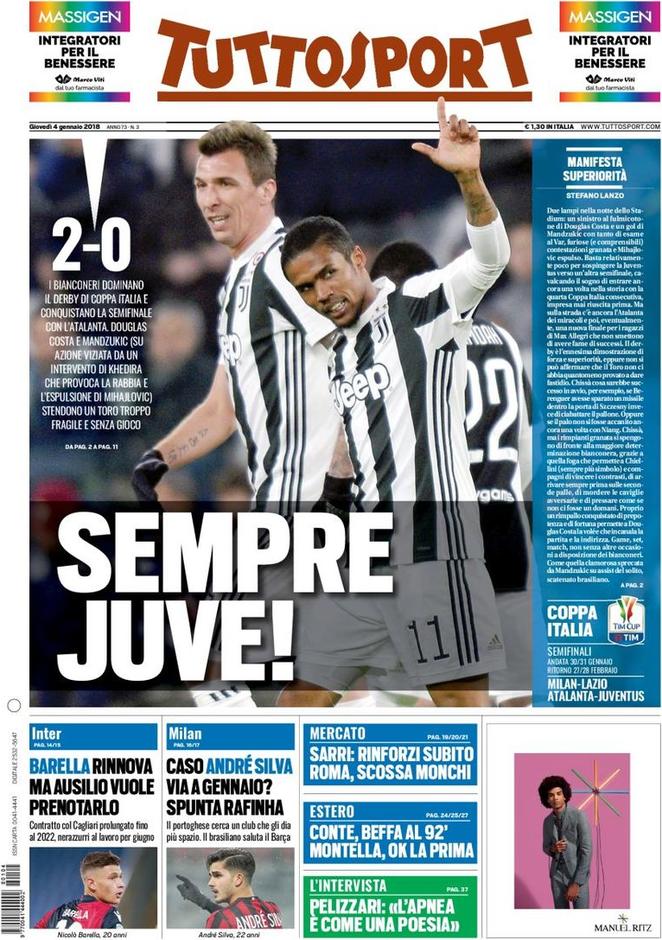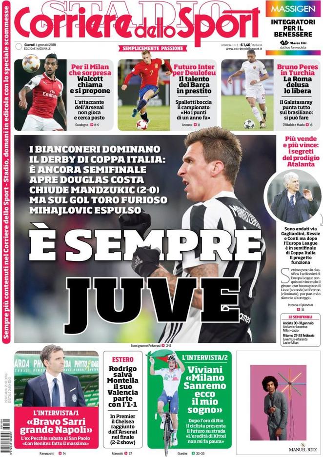 Molto spazio è dedicato alla vittoria bianconera nel derby piemontese in Coppa Italia; manca l’originalità per quel che riguarda il titolo da prima pagina per entrambi i giornali, ma non mancano notizie di emrcato. Queste ultime interessano anche l’Inter, alla ricerca di rinforzi data la rosa corta. Il nome più caldo è quello di Deulofeu, esterno del Barça che potrebbe arrivare a Milano (questa volta sponda nerazzurra) in prestito. E secondo il CdS le possibilità sono molte e la trattativa può finalizzarsi al meglio; infatti il futuro dello spagnolo per la testata sportiva è nerazzurro.