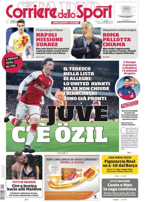 L’apertura del Corriere dello Sport è per la Juventus: “C’è Özil nella lista di Allegri“. Nel taglio alto il Napoli che punta a Denis Suarez e la Roma sulle tracce di Barella. In basso La Liga: “Figuraccia Real, a -16 dal Barcellona“.