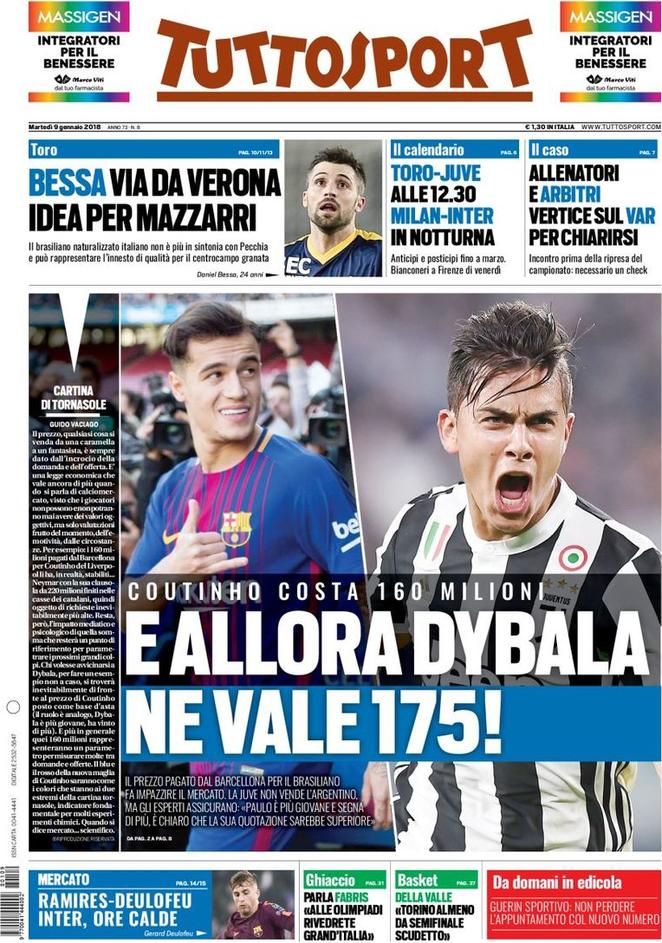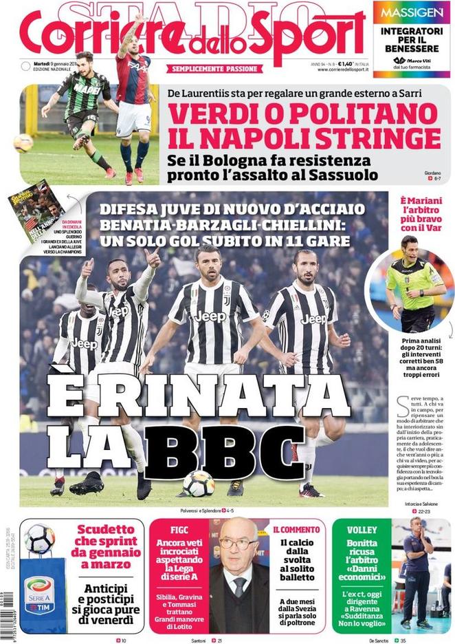 La prima pagina di Tuttosport riporta una notizia di mercato riguardante l’Inter. I nerazzurri, infatti, starebbero cercando di convincere Suning e lo Jiangsu a portare in nerazzurro Ramires, centrocampista ex Chelsea. Caldo anche l’asse Milano-Barcellona: si lavora, infatti, per poter portare nuovamente nel capoluogo lombardo, ma stavolta sponda nerazzurra, Gerard Deulofeu. Nessun riferimento ai nerazzurri, invece, guardando alla prima pagina del Corriere dello Sport. Il quotidiano, infatti, mette in risalto la ritrovata solidità della difesa bianconera. E’ di nuovo BBC, ma invece di Bonucci c’è Benatia. Poco importa, a quanto pare: il fortino bianconero sembra tornato.