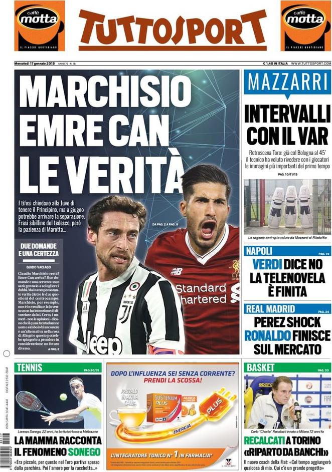 Tuttosport dedica invece la propria apertura alla Juve: “Marchisio, Emre Can: la verità”. A lato: “Mazzarri, intervalli con il VAR”, “Napoli, Verdi dice no: la telenovela è finita”, “Real Madrid, Perez shock: Ronaldo sul mercato”.