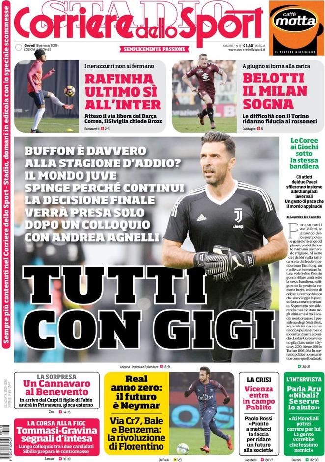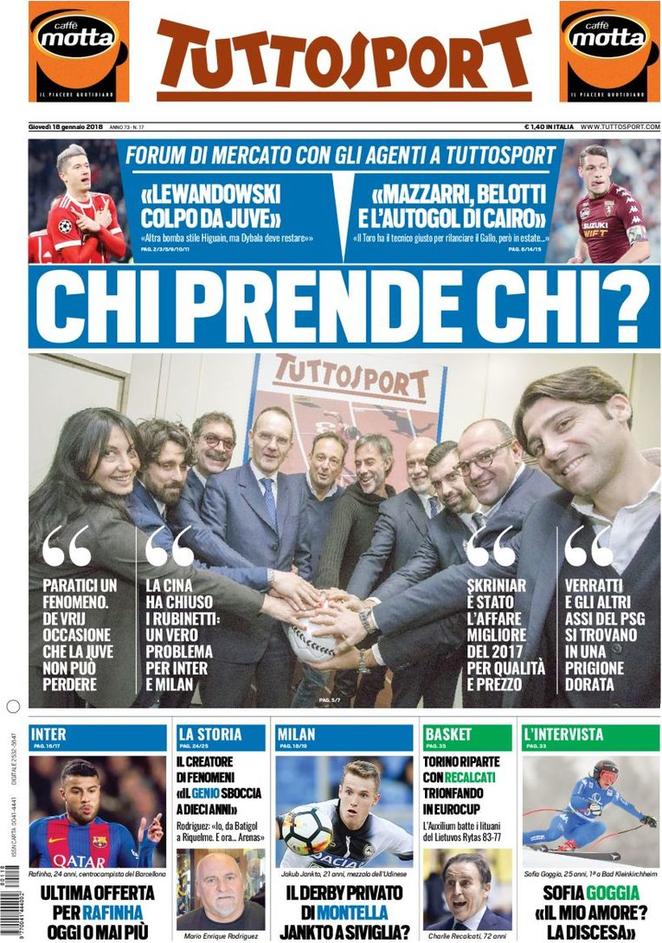 La prima pagina di Tuttosport contiene una notizia di calciomercato relativa all’Inter. Siamo alla stretta finale, infatti, tra il club nerazzurro ed il Barcellona per portare a Milano Rafinha Alcantara. Per il brasiliano, Ausilio ha chiesto un prestito con diritto di riscatto fissato a 35 milioni. A 40, i catalani saranno soddisfatti. La sensazione, però, è che questa sia la giornata decisiva, in un senso o nell’altro. Inter-Rafinha, domani, potrebbe essere conclusa, trovando un finale positivo o negativo. Sensazione riportata anche dal Corriere dello Sport, che aggiunge però un dettaglio riguardante le trattative in uscita. L’Inter, infatti, è in contatto con il Siviglia per uno scambio: Marcelo Brozovic in Andalusia e Joaquin Correa in nerazzurro. C’è già il sì di Vincenzo Montella, che ha quindi avallato l’operazione.