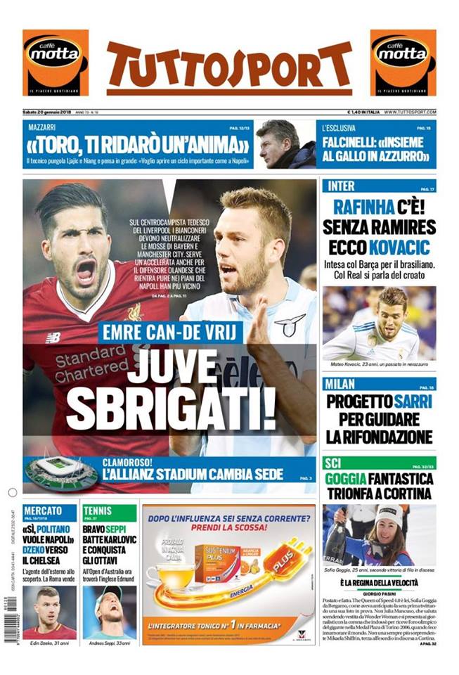 Bomba di mercato quella di Tuttosport: dopo il colpo Rafinha l’inter potrebbe pescare ancora in Spagna, facendo tornare a casa un vecchio idolo della tifoseria come Mateo Kovacic. Il croato potrebbe tornare all’Inter in caso Suning continui ad opporsi alla trattativa per Ramirez. Inter che deve fare attenzione al mercato interno: la Juve è forte, oltre che su Emre Can anche su Stefan De Vrij, pallino nerazzurro che potrebbe finire presto in bianconero. Le altre big del campionato sono attivissime sul mercato: Dzeko sta per lasciare ROma destinazione Chelsea di Conte, il Napoli dopo i no di Deulofeu e Verdi si consola con Politano.