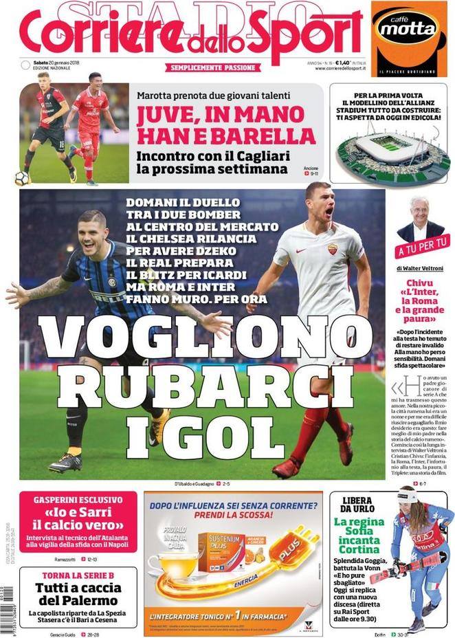 Il Corriere dello Sport in prima pagina lancia l’allarme. Le big estere vogliono soffiarci i bomber del nostro campionato. Inter-Roma di domani potrebbe essere visto come un derby tra i due centravanti più chiacchierati del mercato: Mauro Icardi, corteggiato da Perez per il suo Real e Edin Dzeko, destinato al Chelsea di Conte. Nel frattempo la Juve continua ad accaparrarsi i migliori talenti in Italia, visto che per il quotidiano romano è fatta per Han e Barella, entrambi del Cagliari.