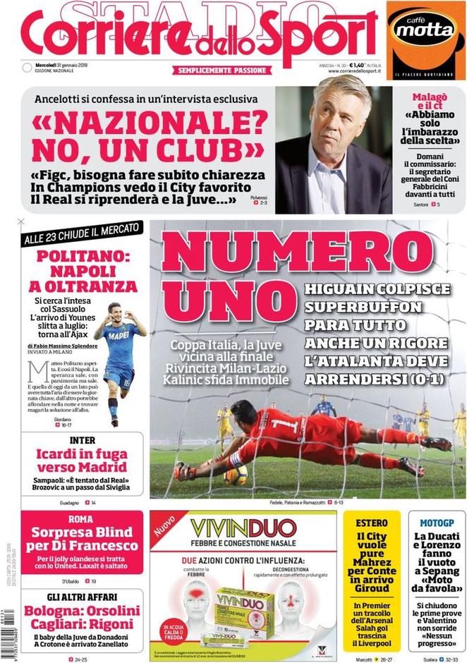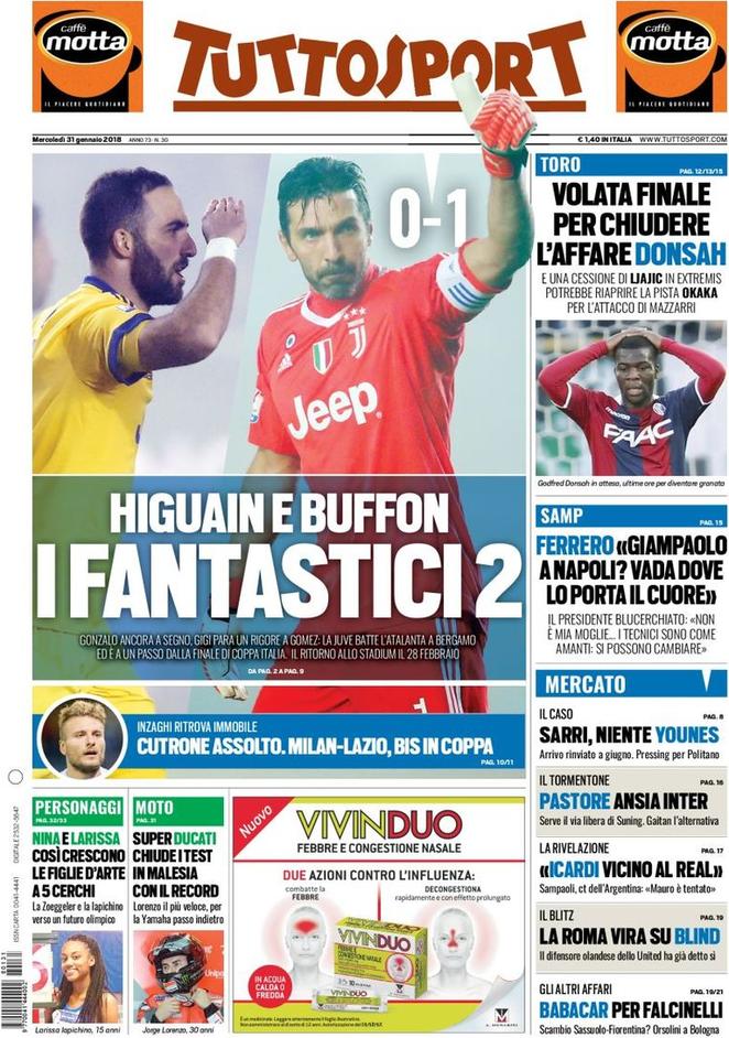 Molta attenzione va sul match di Coppa Italia che ha visto protagoniste Juventus e Atalanta. I bianconeri nonostante la nebbia hanno avuto la meglio sui bergamaschi; a decidere il match, terminato sullo 0-1 è stato Higuain, con un goal ad inizio partita. Importante anche l’intervento su calcio0 di rigore del Papu Gomez di Buffon, ritornato a disposizione di Allegri e nel migliore dei modi. Nella colonna adiacente, largo spazio al mercato, ed ecco l’Inter. TS non nasconde la preoccupazione che ci sarebbe in casa Inter per la questione attorno a Pastore. Serve il via libera di Suning, altrimenti si punterà su alternative come Gaitan.