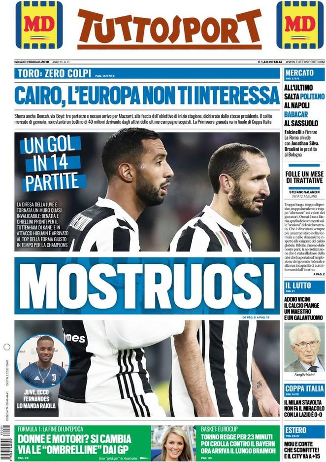 TuttoSport apre come di consueto parlando di Juve, che nelle ultime 14 partite, pur faticando, ha dimostrato di avere una difesa granitica subendo solo un goal. Spazio poi anche alla chiusura mesta e senza botti del mercato invernale e allo 0 a 0 di Coppa Italia fra Milan e Lazio.