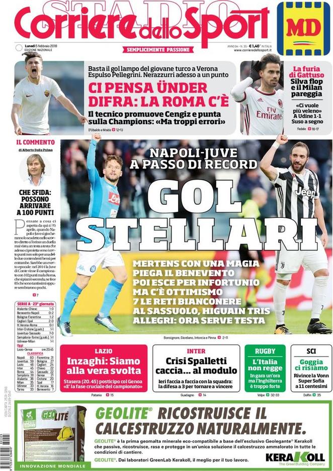 Si parla della giornata di campionato e non solo sui quotidiani sportivi questa mattina in edicola. Le vittorie di Juventus e Napoli in primo piano, ma anche il ritorno ai tre punti della Roma, che si sblocca in quel di Verona: “Festival Juve” l’apertura di Tuttosport, tutta dedicata alla goleada dei bianconeri ai danni del Sassuolo: “Sette gol al Sassuolo – si legge nel sommario, e prima tripletta per Higuain in bianconero. Doppietta di Khedira, a segno anche Alex Sandro e Pjanic. Allegri adesso ha l’attacco più prolifico della Serie A”. Taglio laterale per il Milan, frenato ad Udine:”Calabria e Silva frenano Gattuso”. Riguardo l’Inter, Tuttosport e Il Corriere dello Sport si soffermano sulla possibilità di un cambio modulo da parte di Spalletti.