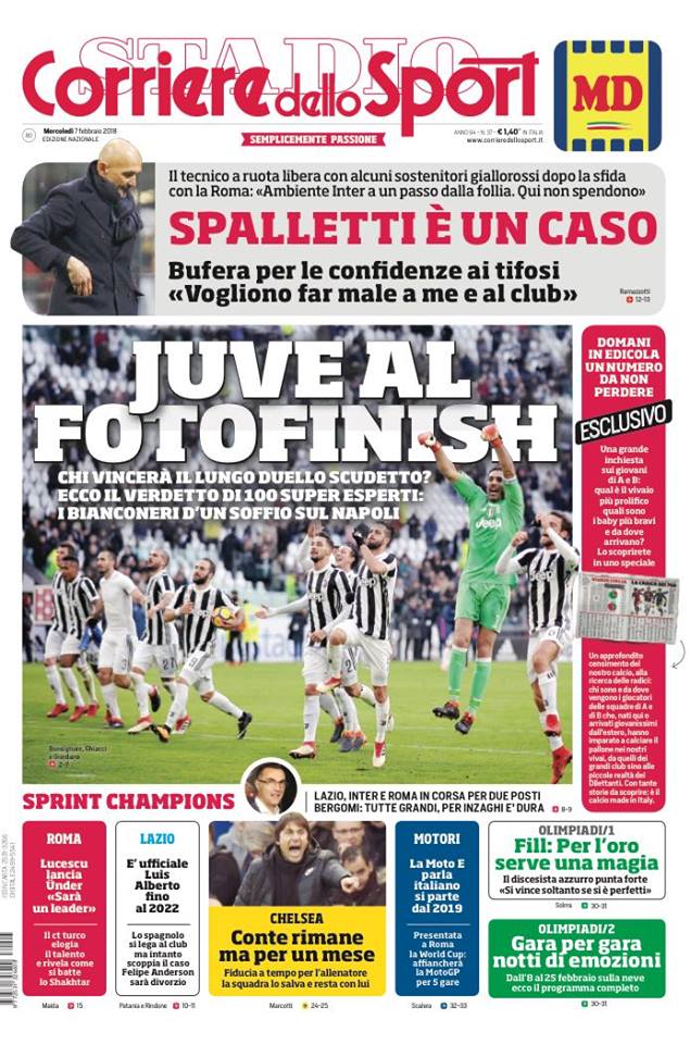 Il Corriere non riprende la notizia della Juve su Icardi ma scrive comunque dell’altra bufera in casa Inter che vede protagonista il tecnico Spalletti. Focus sullo sprint scudetto, per i 100 esperti del giornale sarà la Juventus a vincere, per un soffio sul Napoli. Lucescu lancia Under della Roma: “Sarà un grande”. La Lazio rinnova con Luis Alberto mentre la squadra salva Conte dall’esonero: fiducia a tempo per il mister salentino.