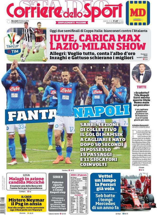 Il Corriere dello Sport tutto è concentrato sulla Coppa Italia e sul Napoli. L’Inter non è presente nella prima pagina.