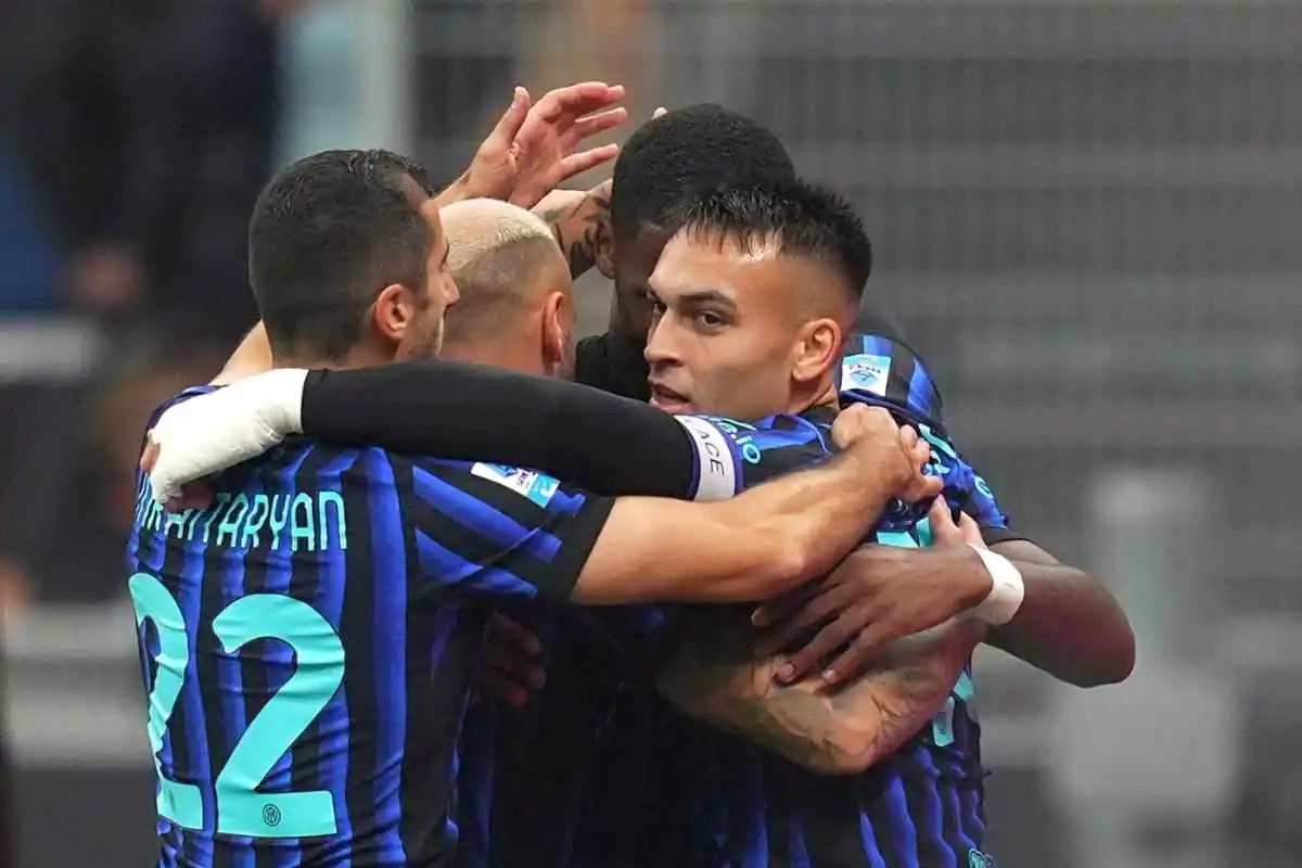 Lautaro Martinez festeggia con i compagni dell’Inter dopo una rete in campionato.