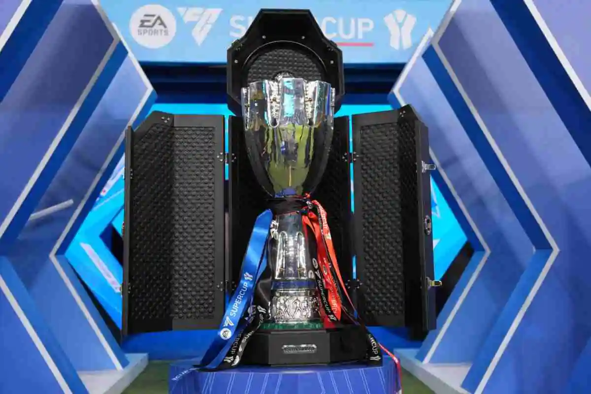 Il trofeo della Supercoppa Italiana EA Sports FC 2025 esposto sul campo prima della finale.