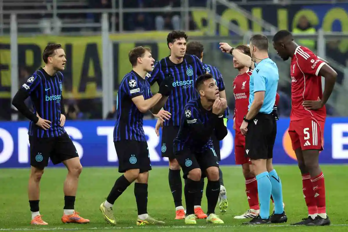 I giocatori dell'Inter protestano con l'arbitro Zwayer dopo il rigore assegnato al Liverpool